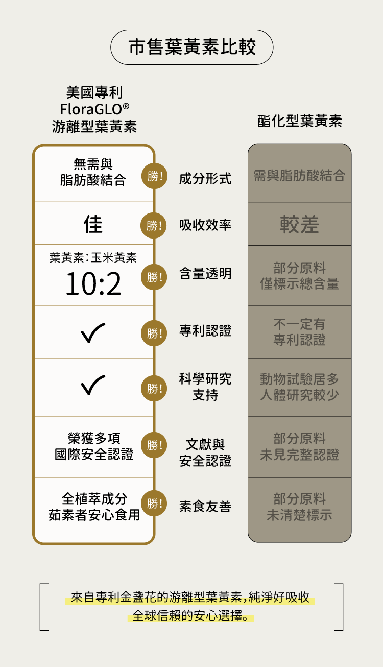 許多人選購葉黃素時會聽到「游離型」或「酯化型」這些術語,其實這是葉黃素分子結構上的不同。其中游離型葉黃素較為常見於臨床研究中,吸收效率也受到不少文獻關注。