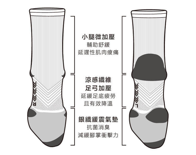 - 足弓加壓:促進血液循環,長時間運動雙足不腫脹